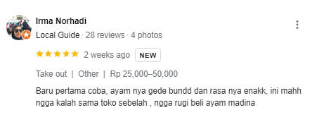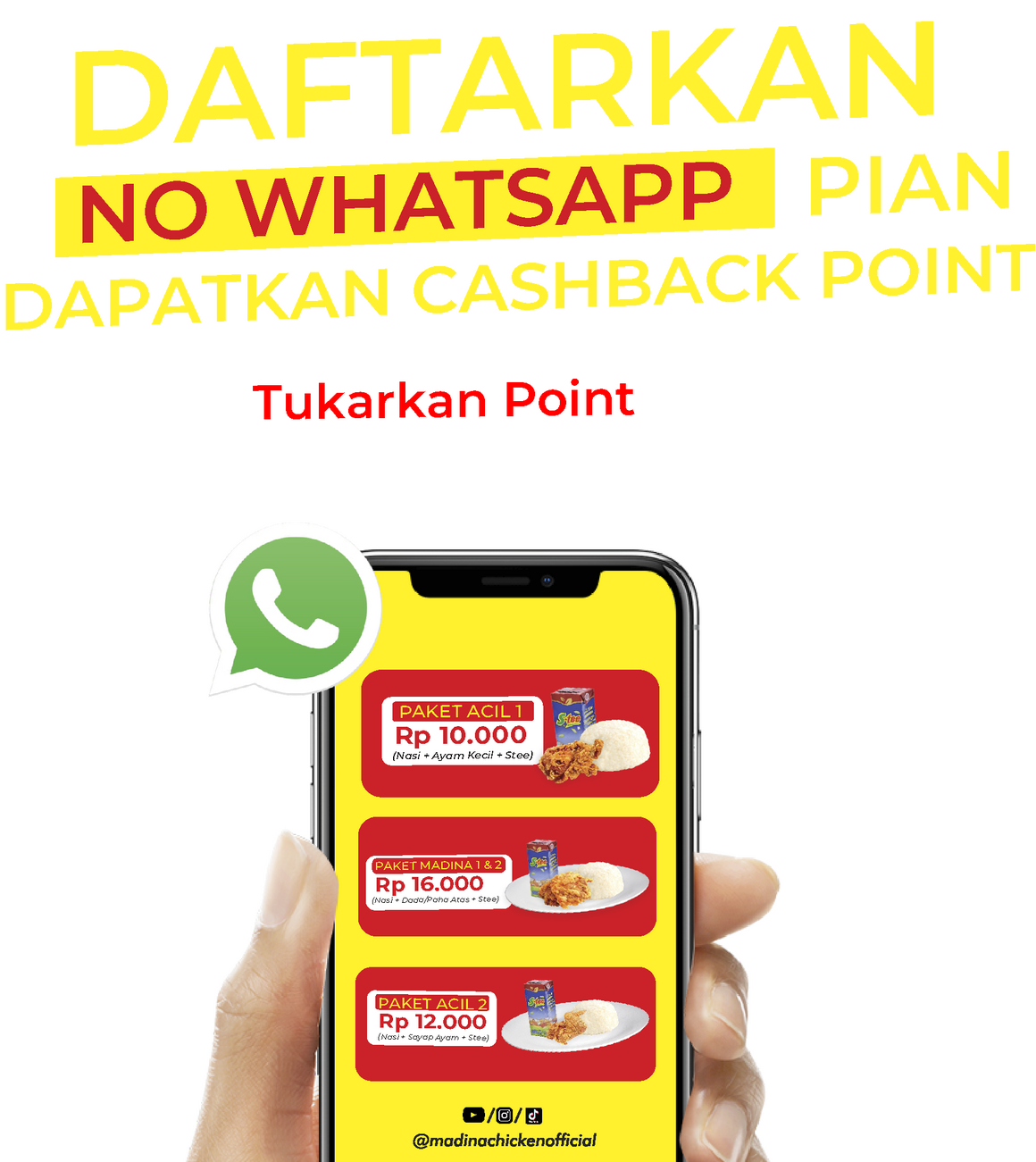 Dengan harga yang terjangkau, Madina Chicken dapat menjangkau berbagai kalangan masyarakat yang ingin merasakan makanan mewah dan lezat.Madina Chicken juga memberikan Cashback 1.000 point setiap belanja minimal Rp. 20.000 (berlaku kelipatan), yang mana point tersebut dapat dibelanjakan dengan all produk madina chicken.Cukup daftarkan nomor WA pian saat transaksi di kasir dan langsung dapatkan Cashback Points setiap belanja di Madina Chicken