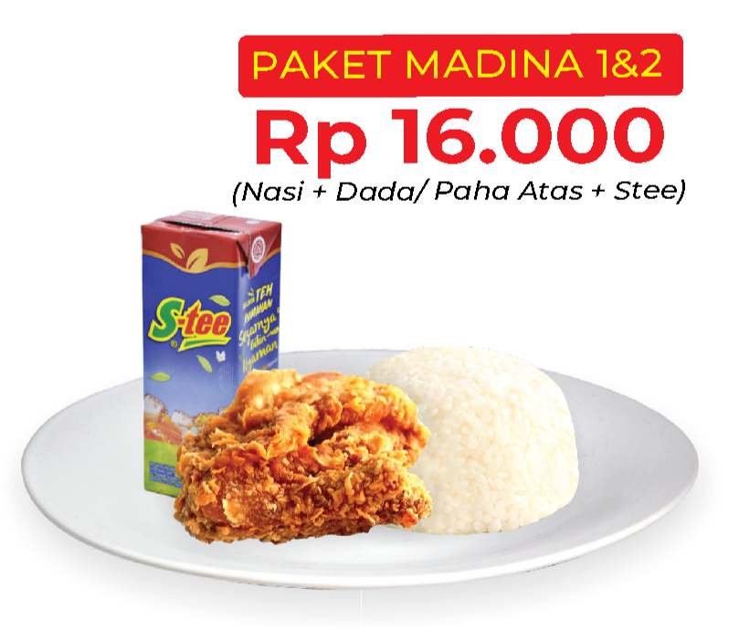 Rasa Madina Chicken merupakan hasil riset bumbu selama kurang lebih 1 tahun dengan puluhan kali percobaan sehingga menghasilkan sebuah rasa yang khas & lezat.Madina Chicken menggunakan daging ayam segar berkualitas tinggi, sehingga produk yang dihasilkan terjamin kualitasnya, termasuk bahan-bahan pokok pendukung lainnya seperti tepung terigu, saus sambal, minyak goreng yang merupakan bahan dengan kualitas terbaik.